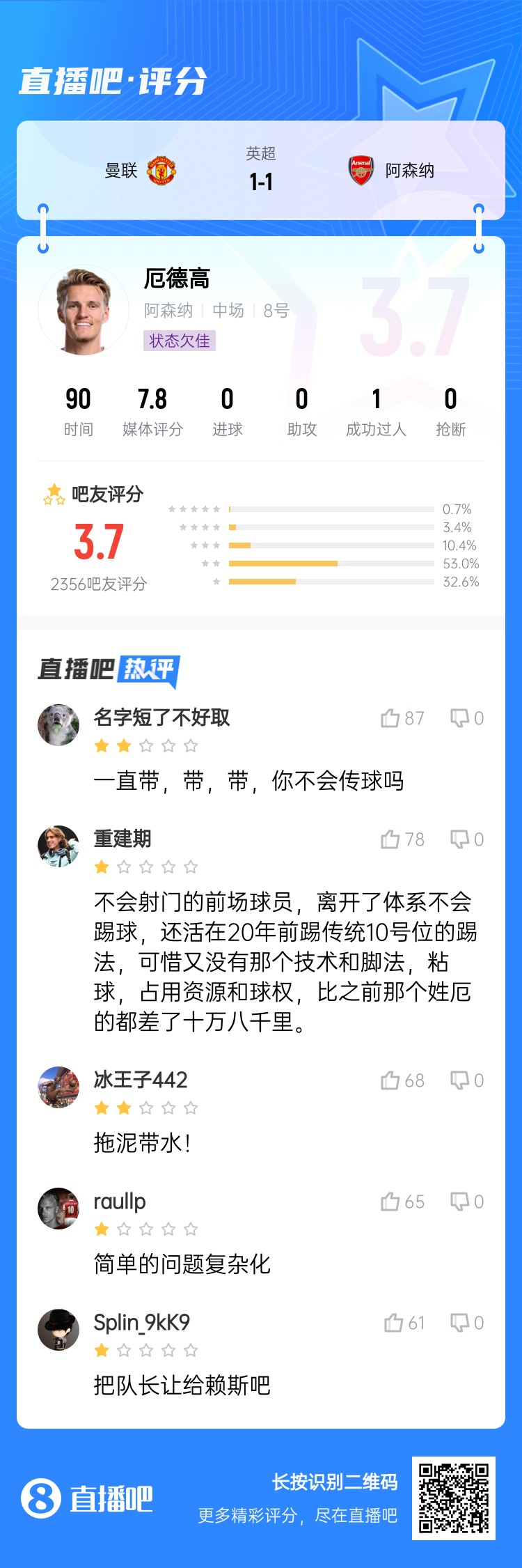 英超第28輪,阿森納客場(chǎng)1-1戰(zhàn)平曼聯(lián)。厄德高本場(chǎng)比賽首發(fā)踢滿(mǎn)全場(chǎng),發(fā)揮糟糕。