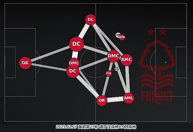 穆里略和米倫科維奇配合默契,埃蘭加和奧多伊可以深度退守保護邊后衛(wèi),克里斯-伍德總是在不停干擾對手的傳遞,吉布斯-懷特甚至能夠來到中衛(wèi)身前扮演清道夫……諾丁漢森林擁有正面防守能力出眾的中衛(wèi)組合,他們身邊聚集了多名柔韌性出眾、腳下纏斗能力強且愿意防守的攻擊手。努諾-桑托的球隊防守時頗具拉丁風味,依靠錯落有致的三線結(jié)構(gòu)堵塞禁區(qū)空間,就是他們的招牌動作。