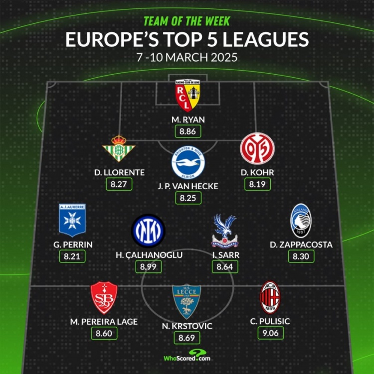 whoscored本周五大聯(lián)賽最佳陣:普利西奇&恰20領(lǐng)銜,袋鼠國門在列