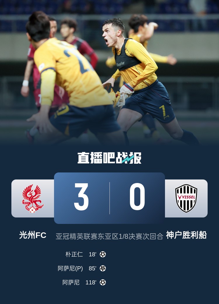 3月13日訊 亞冠精英聯(lián)賽1/8決賽次回合,光州FC在首回合客場兩球落敗的情況下,主場完成逆轉(zhuǎn),以3-0的比分擊敗神戶勝利船,晉級(jí)下一階段。