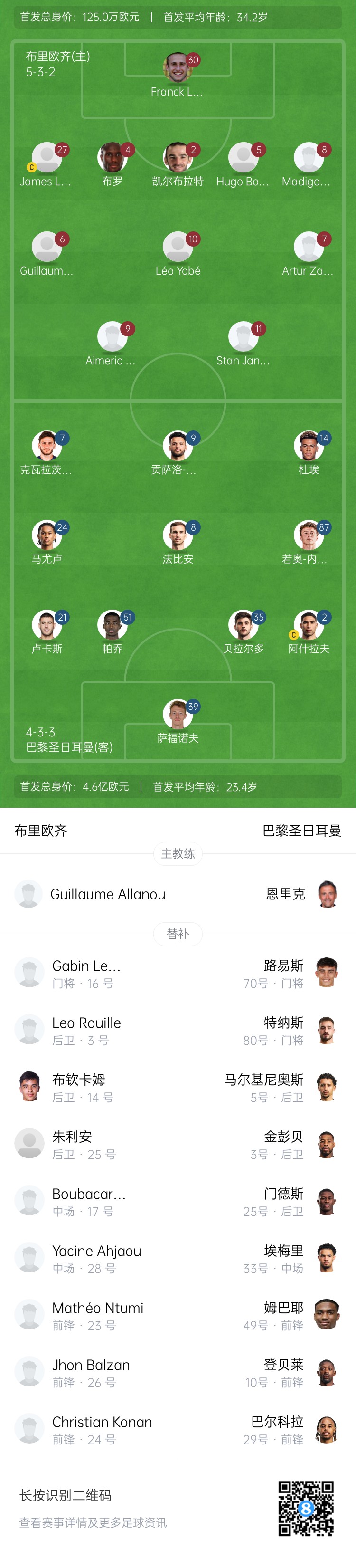 02月26日訊 法國杯1/4決賽,布里歐齊主場(chǎng)vs巴黎圣日耳曼即將打響。賽前首發(fā)出爐。