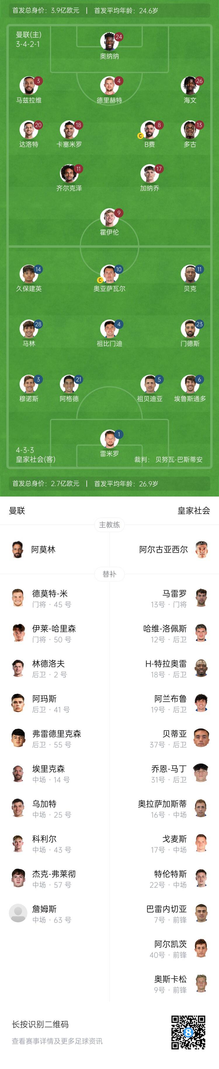 曼聯vs皇社首發(fā)出爐:B費領銜 久保建英、多古、海文先發(fā)