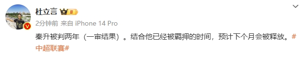 媒體人杜立言消息,秦升被判兩年(一審結(jié)果)。結(jié)合他已經(jīng)被羈押的時(shí)間,預(yù)計(jì)下個(gè)月會(huì)被釋放。