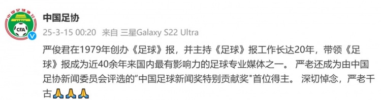 中國足協(xié)發(fā)文悼念《足球》報創(chuàng)刊人嚴(yán)俊君:深切悼念,嚴(yán)老千古