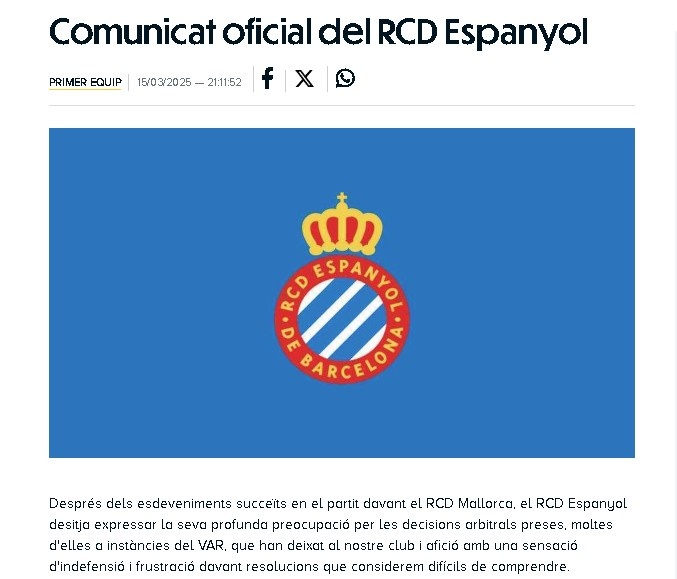 西班牙人足球俱樂部始終對(duì)裁判團(tuán)隊(duì)保持有最高尊重,并將繼續(xù)如此,充分認(rèn)可裁判工作的復(fù)雜性與責(zé)任重大性。然而,俱樂部認(rèn)為這種尊重應(yīng)當(dāng)是相互的,應(yīng)該體現(xiàn)在對(duì)百年俱樂部、球員、教練團(tuán)隊(duì)和球迷的公平對(duì)待上。