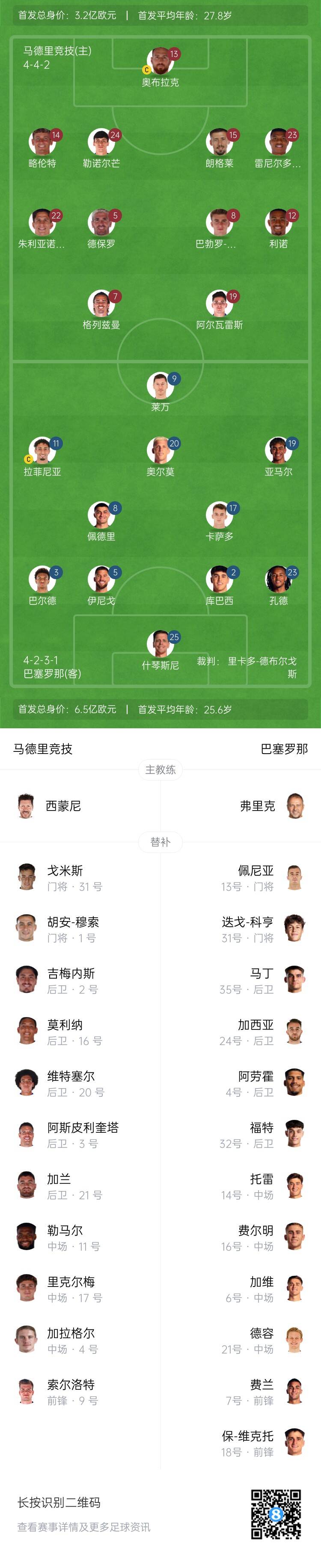 馬競(jìng)vs巴薩首發(fā):小蜘蛛、格列茲曼先發(fā),萊萬(wàn)、亞馬爾出戰(zhàn)