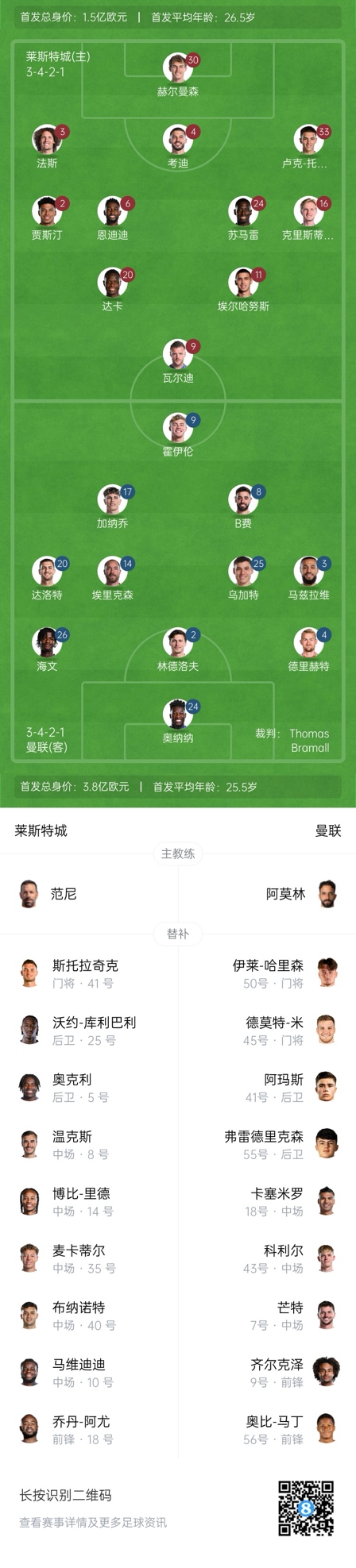 曼聯(lián)替補:45-米、50-哈里森、7-芒特、9-齊爾克澤、18-卡塞米羅、41-阿瑪斯、43-科利爾、55-弗雷德里克森、56-奧比-馬丁