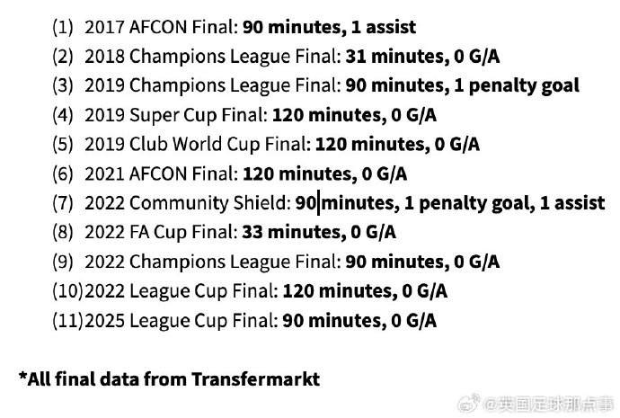 Transfermarkt:薩拉赫至今已代表俱樂部和國家隊(duì)參加了11場決賽,累計(jì)出場約1000分鐘,但從未打入非點(diǎn)球進(jìn)球。