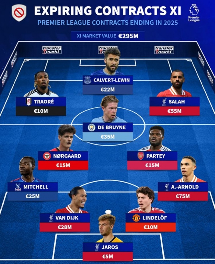 德轉(zhuǎn)列英超合同到期最貴陣:總身價2.95億歐元