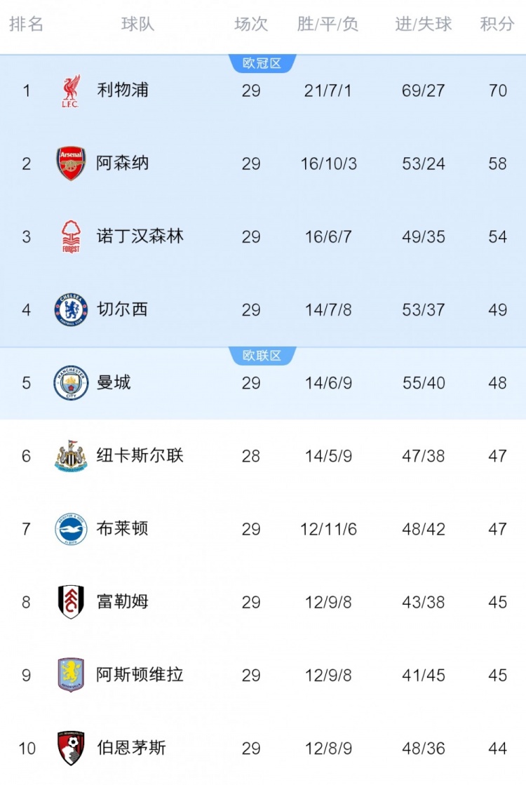 標(biāo)簽: 足球英超曼城諾丁漢森林伯恩茅斯布萊頓紐卡斯?fàn)柭?lián)切爾西阿斯頓維拉富勒姆